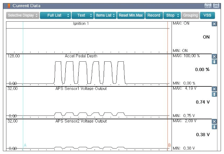- Shift the gear to the P position & Ignition "ON" (Power Button LED "Red"), and select the "Current Data" mode.