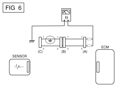1. Disconnect connectors (A), (C) and measure for resistance between connector (A) and Chassis Ground as shown in Fig 6.