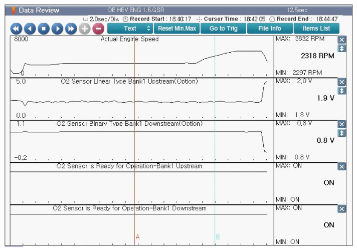 Home >> Kia >> 2017 >> Niro FE >> Repair and Diagnosis >> Engine Performance >> System >> Engine Control System Diagnosis (2 Of 6) >> DTC P013B-00: O2 Sensor Slow Response - Lean To Rich (Bank 1 / Sensor 2) >> DTC Inspection >> Monitor KDS/GDS Data