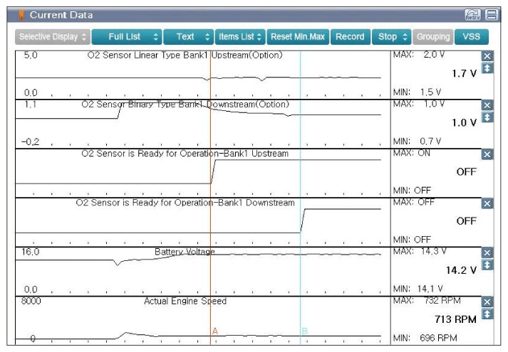 Fig 1: Scantool Display - Upstream O2 Sensor Voltage Current Data When O2 Sensor Ready For Operation At Idle