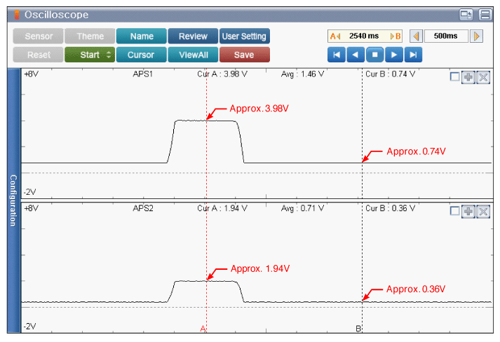 Channel A (+): Pin No. 3 (APS1 Signal) terminal of Accelerator Pedal Position Sensor.