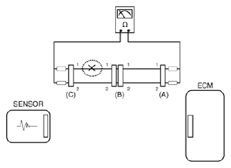 - Disconnect connector (B), and measure for resistance between connector (C) and (B1) and between (B2) and (A) as shown in [figure below.].