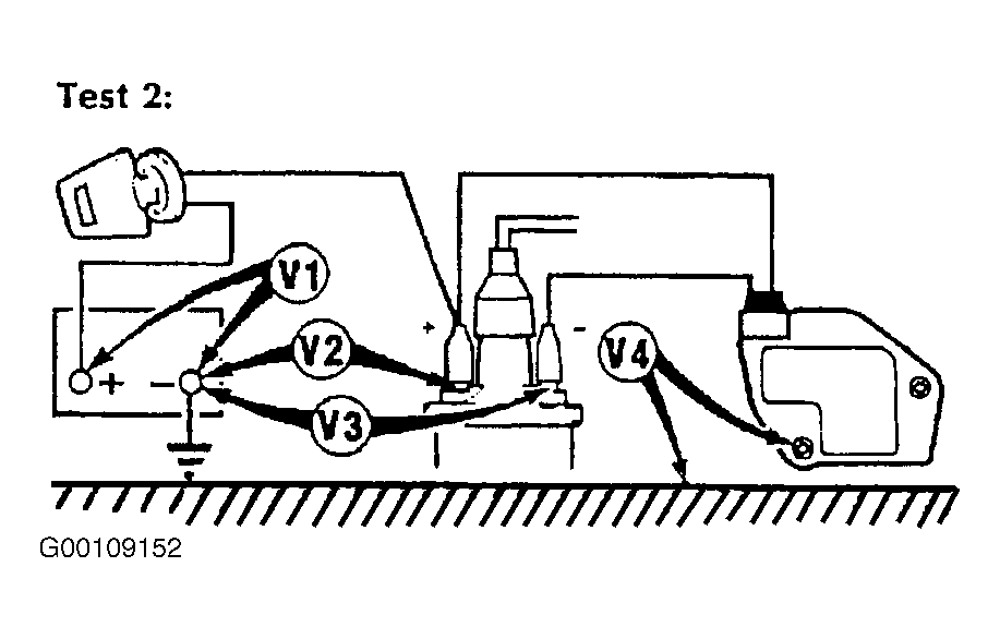 . Readings for V1 should be more than 12 volts. Readings for V2 should be 1 volt maximum below volts at V1. Readings for V3 should be 1 volt maximum below volts at V1. Readings for V4 should be 0.0-0.1 volt.