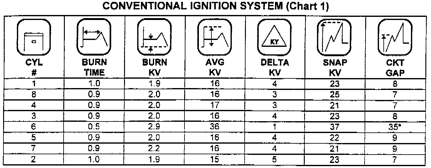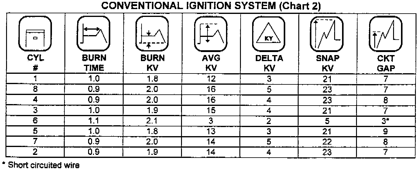 A very low average KV, around 2-3 KV (see analyzer reading Chart 2) indicates a short circuit in the plug wire or spark plug. Check for short circuit in the plug wire or ground electrode contacting center electrode of the spark plug. Any wires that are out of the above specification or show signs of arcing must be replaced.