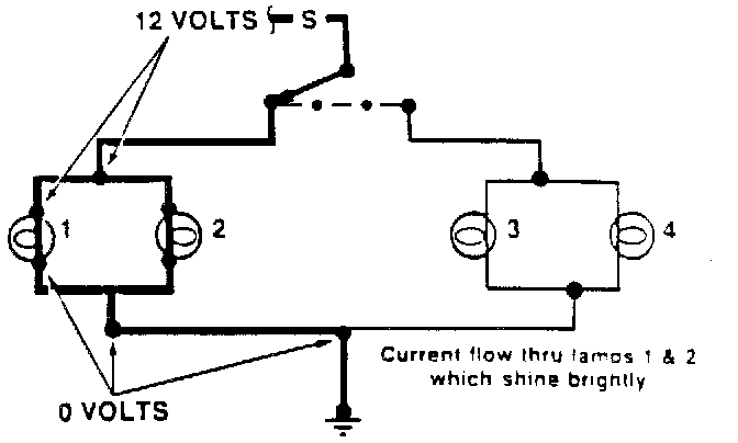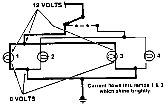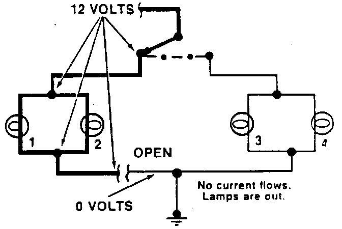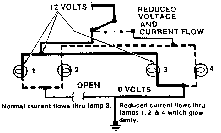 However, when an open occurs in the ground side of the powered branch, an alternate path to ground exists through lamps "Two" and "Four" Lamps "One," "Two," and "Four" then are in series, and all are in parallel with lamp "Three" The higher resistance in the series branch of the circuit will cause lamps "One," "Two" and "Four" to glow dimly, while lamp "Three," having less resistance, will glow brightly. The voltage reading will be Twelve Volts at both lamp "One" and "Three." In diagnosing for opens, therefore, it is helpful to study the wiring diagram for common points in the circuit and to look for alternate current paths.