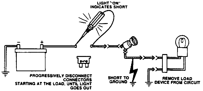 In a short circuit to ground in which the wiring harness is not visibly or outwardly damaged, a LED test light can be substituted for the blown fuse to limit the current flowing in the circuit. If the light glows with all the load devices in the circuit disconnected, it indicates a short to ground. Connectors in the circuit can then be disconnected working back up the circuit from the load devices until the test light goes out. The short is located between the disconnected connector and the previously disconnected connector.