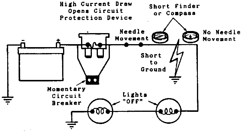 Another method used to find shorts to ground is with a Short Finder or Compass. A momentary circuit breaker is substituted for the fuse. This circuit breaker will open and close the circuit as it heats up and cools down. A Compass or Short Finder can be used to trace along the circuit. As the circuit breaker opens and closes it will cause a magnetic field to build up and collapse the conductor.