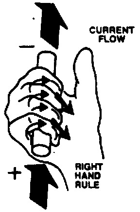 The direction of the magnetic field can be determined by using the RIGHT HAND RULE. If you place your right hand over the conductor with your thumb pointing in the direction of current flow (from "+' to "-," or towards "-"), your curled fingers will show the direction of the magnetic field and the lines of force.