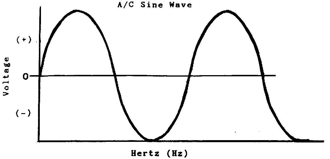 AC (alternating current) is electricity that changes its direction at regular definite time intervals or frequency. This AC current changes its direction according to the Law of Sines. As shown in the graph, the current first increases to its peak, then decreases through zero. It changes its direction, increasing to its peak, then decreasing back through zero. This process continues to form a frequency or Sine Wave. The unit of frequency we use to measure the speed at which the current changes direction is called Hertz (Hz). In automobiles, AC current is produced by AC generators (Alternators) and, through the use of diodes, is changed to DC.