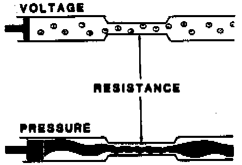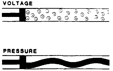 A storage battery and a water tower are similar, they both provide pressure. The battery is a source of electrical pressure and the water tower supplies water pressure. In other words, voltage is simply electrical pressure. And, it's voltage that pushes electricity through the wires in a circuit just as pressure pushes water through the pipes in a plumbing system.