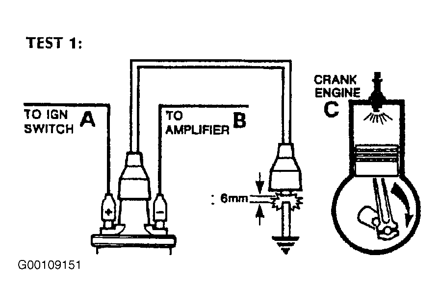 Disconnect secondary ignition coil wire from distributor cap and hold it approximately 0.25" (6 mm) from engine block, using suitable insulated pliers. See Fig 1 . Crank engine. If sparking is present, check for faulty distributor cap, rotor arm and wires. Also check for incorrect ignition timing. If all components are okay, go to ROTOR ARM TEST . If no spark or weak spark is present, go to PRIMARY IGNITION SYSTEM VOLTAGE TEST .
