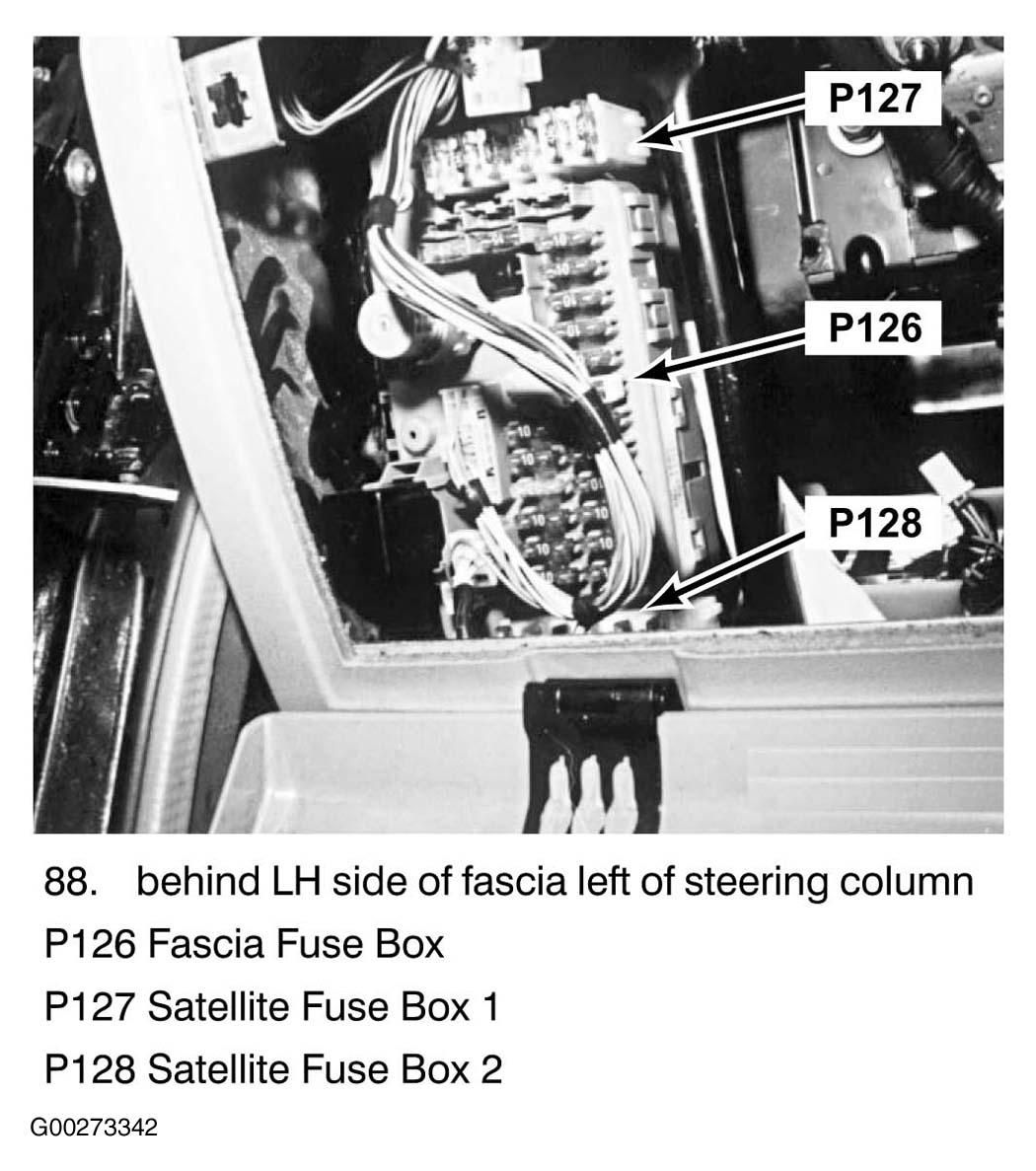 2. Check for a blown fuse F3 (30-amp), located in fascia fuse box, behind left side of fascia. See Fig 1 . If fuse is okay, check for a blowen fuse F7 (20-amp), located in engine compartment fuse box, right front of engine compartment. See Figure . If fuse is okay, backprobing, measure voltage at condenser fan relay terminal No. 86 (Black/Purple wire). Condenser fan relay is located behind right side of fascia on bracket. See Fig 2 . If 12 volts are present but condenser cooling fans are not working, go to next step. If 12 volts are not present, check for short or open in wiring harness between A/C switch and condenser fan relay.