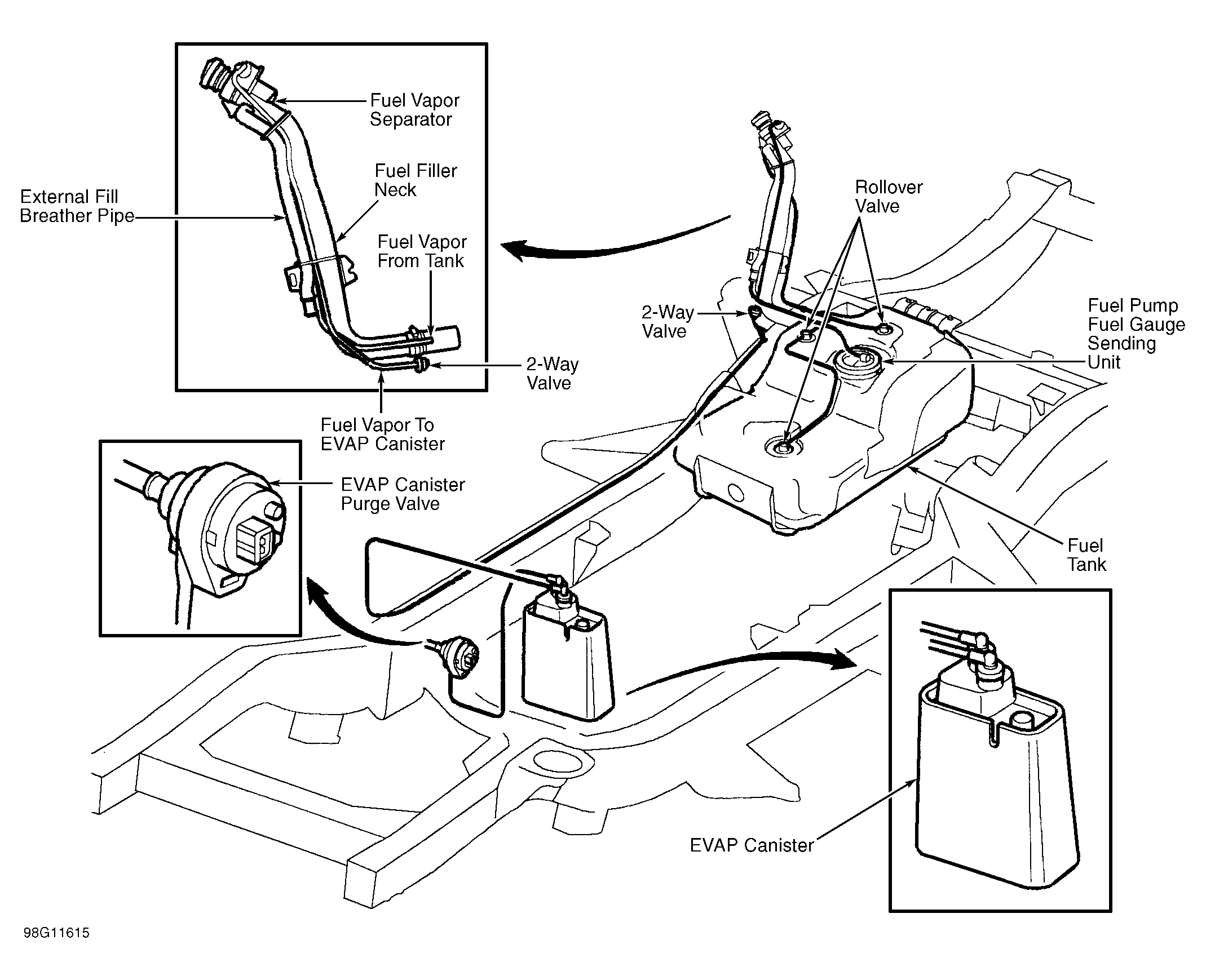 - Ensure fuel tank contains at least 2 gallons of fuel unless there has never been fuel in the system. Ensure fuel filler cap is properly installed. Disconnect line from fuel vapor separator, at EVAP canister. See Fig 1. Using a "T" fitting and adapter, connect nitrogen cylinder and regulator, and a water manometer (0-30" H2O or more) to end of line from fuel vapor separator, at EVAP canister.
