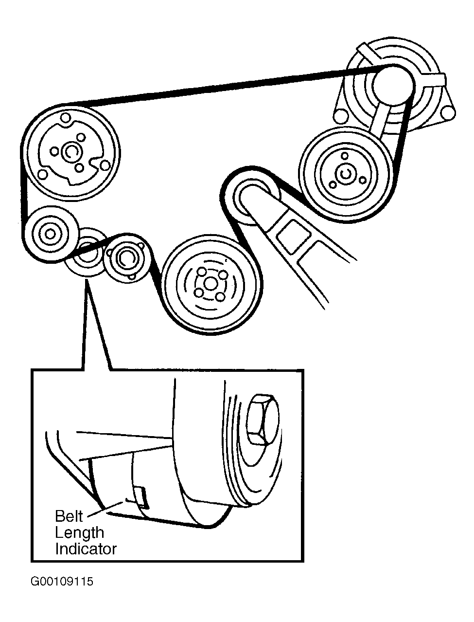 Check condition of drive belt, renew belt that shows sings of wear, slipping or oil contamination. Check belt length indicator. See Fig 1 . Belt must be renewed before indicator reaches right end of slot.