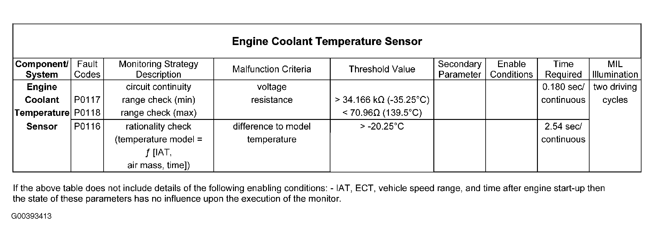 A fault condition is recognized if the ECM is powered up and the ECT sensor resistance exceeds a minimum or maximum threshold, or the difference between the ECT model and the temperature indicated by the ECT sensor is greater than a threshold.
