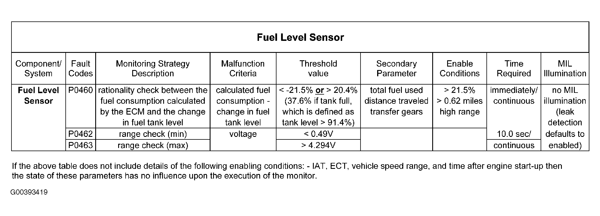 There are three fuel level input diagnostic checks, during which a fault is detected if: