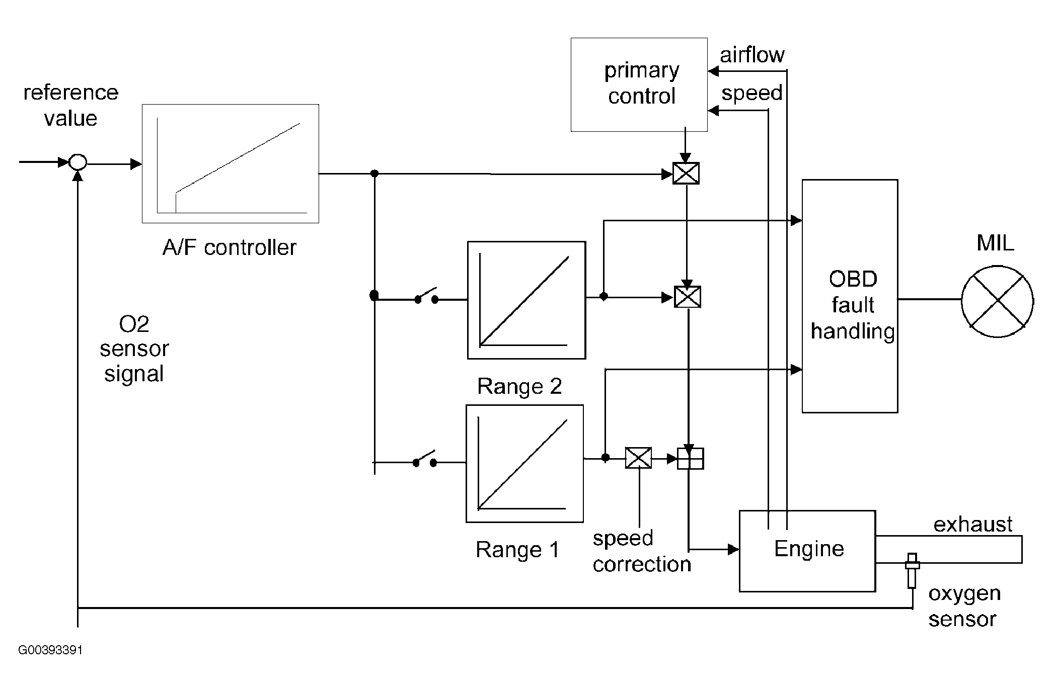 The ECM compares the oxygen sensor signal upstream of the catalyst with a reference value and calculates a correction factor for the primary control. See Fig 1 .