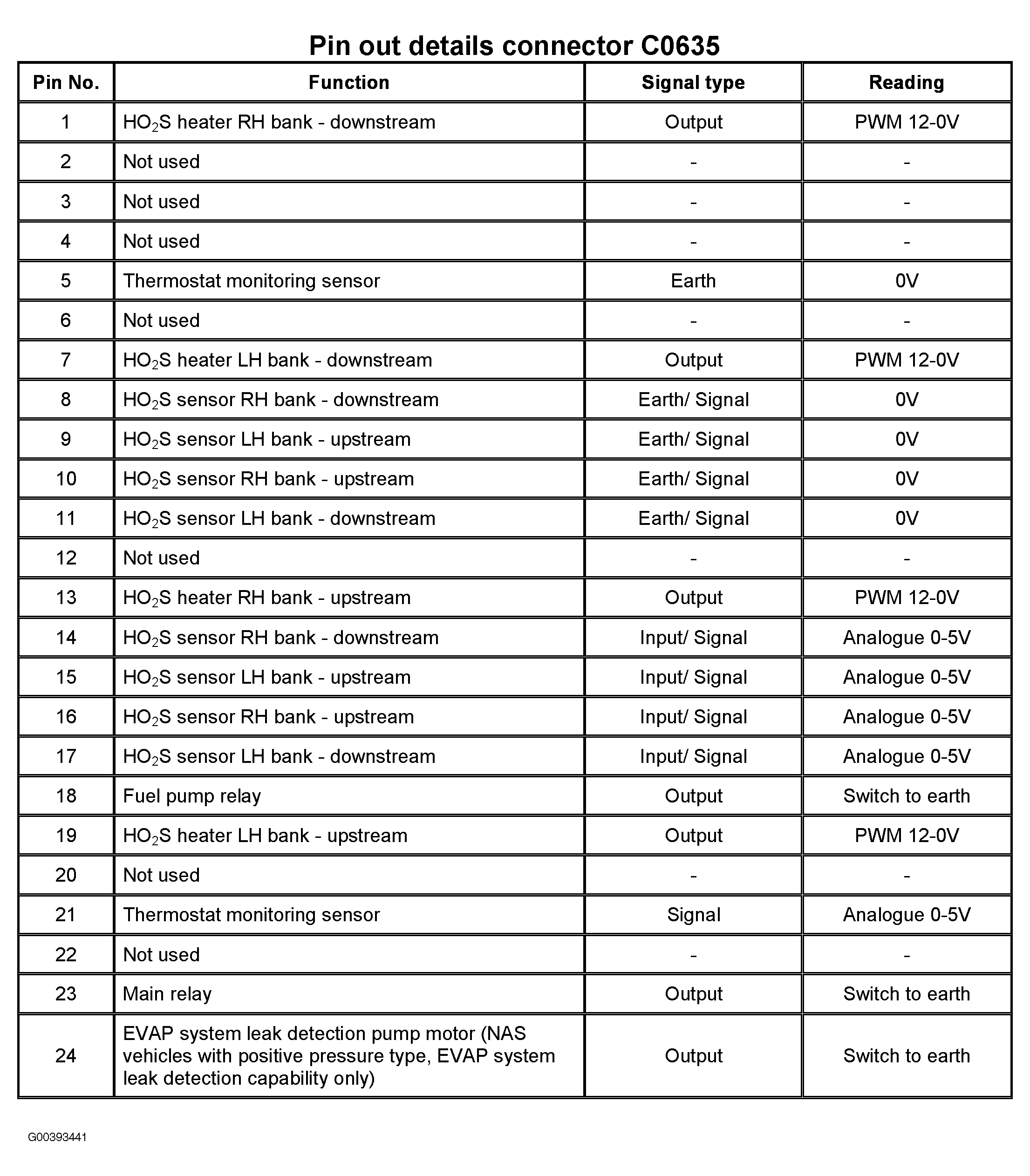 This connector contains 24 pins and is primarily used for Heated Oxygen Sensors (HO2S) control and earth. See Fig 1. The HO2S sensors require a heater circuit to assist in heating the tip of the sensors to enable closed loop fuelling to be implemented quickly after cold starting.