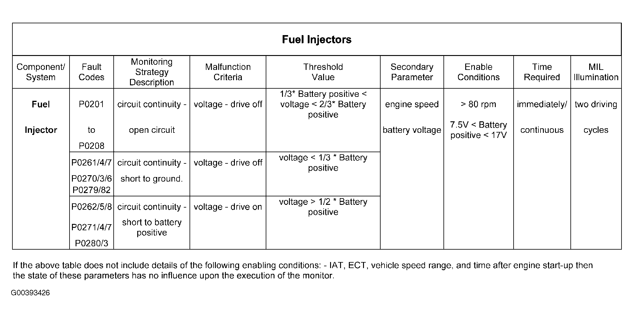 3. Fuel injector driver open circuit, i.e. the driver voltage is greater than one third of the battery voltage but less than two thirds of the battery voltage when the driver is off.