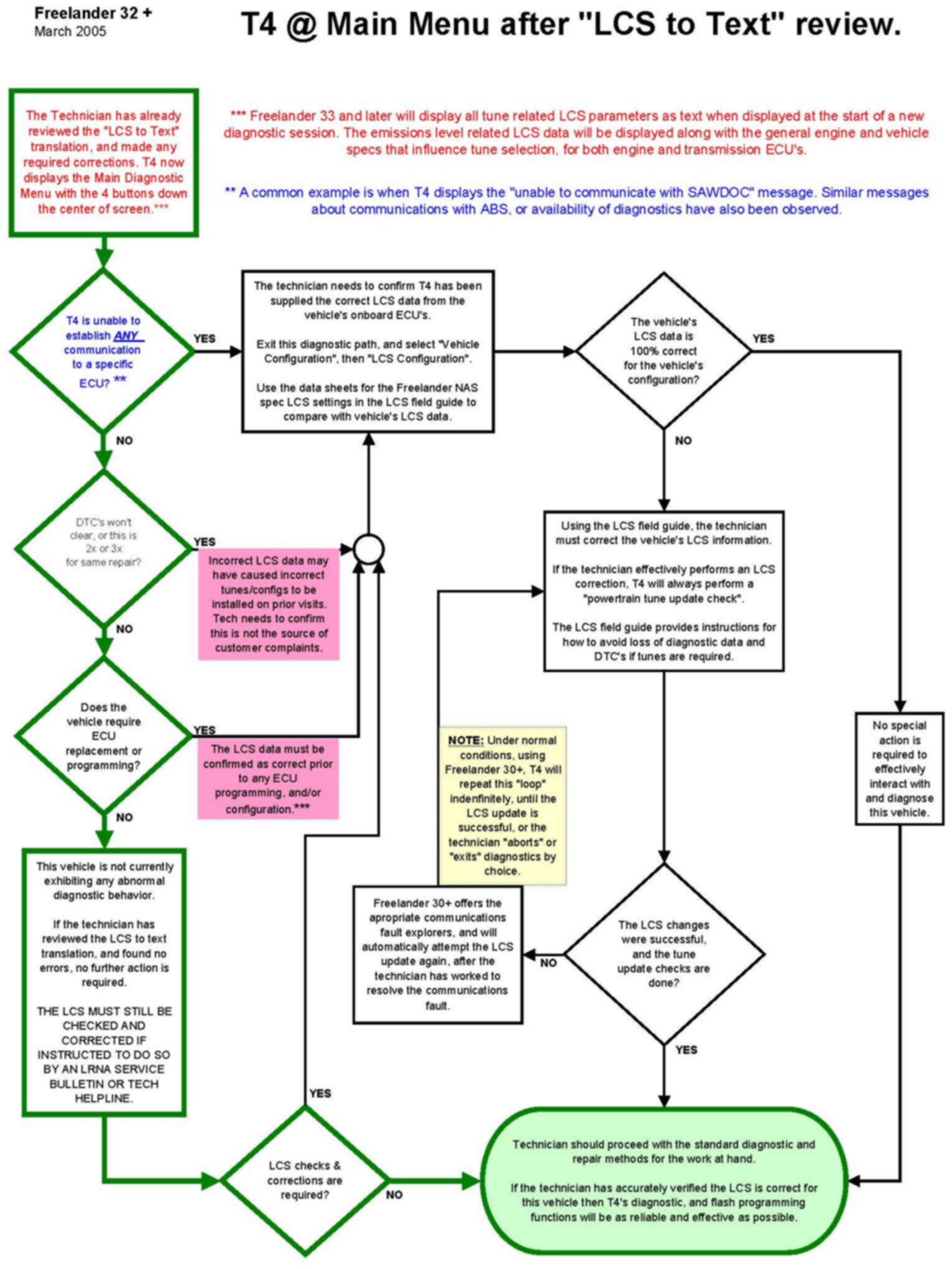 In several places the technician will be referred to the LCS Field Guide published on InfoTrail. Follow the LCS icon parameters to resolve the specific condition encountered. Technicians should read and be familiar with this reference document to aid in understanding the flowcharts.