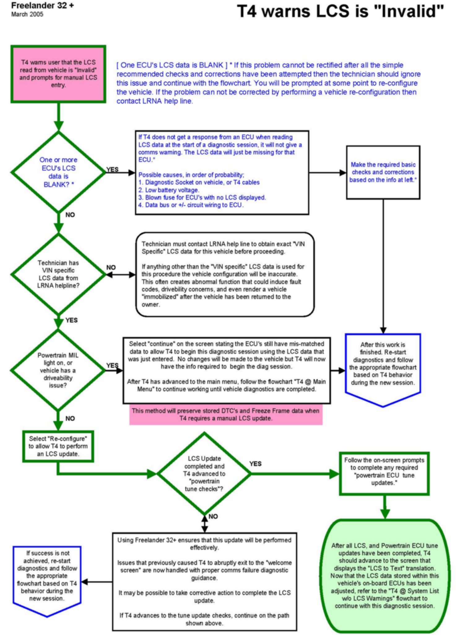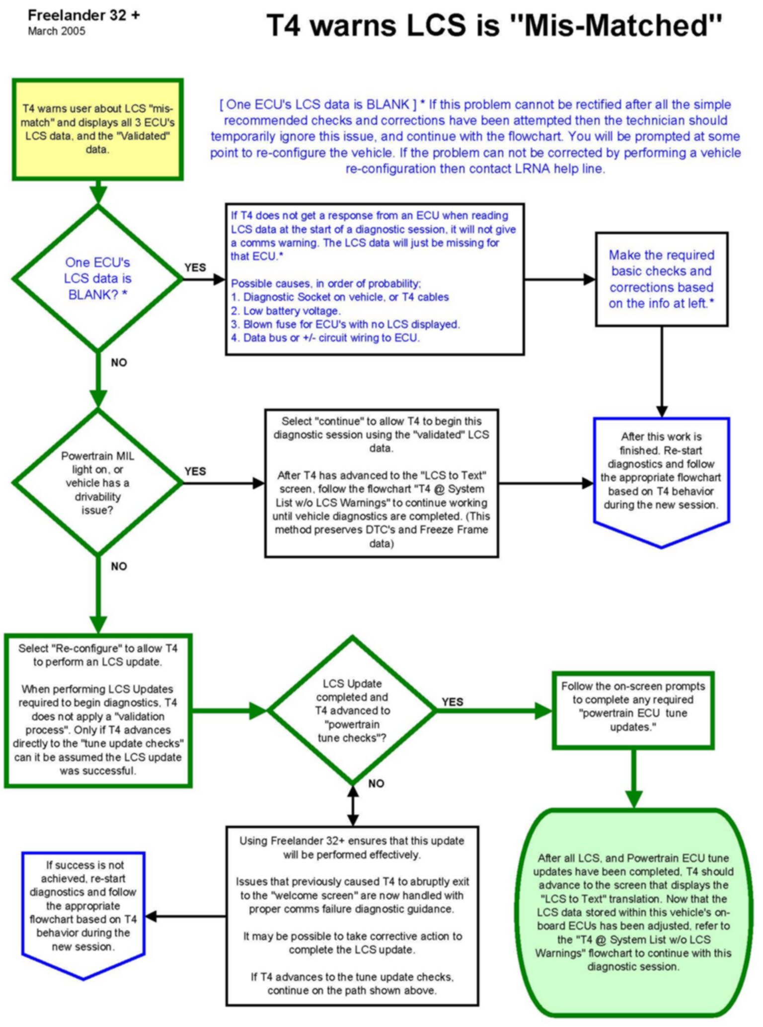 These troubleshooting charts are valid only with Freelander 32 and later. Some key references to Freelander 30 that are inclusive to Freelander 32 and later are also retained.