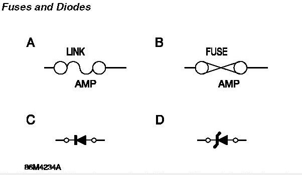 Fusible links (A) and current rated fuses (B) are identified as shown.