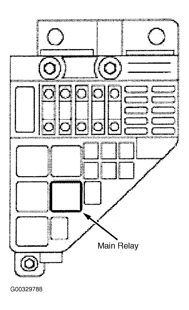 Open engine compartment fuse box. Identify and remove main relay. See Fig 1 . Install main relay. Close engine compartment fuse box.