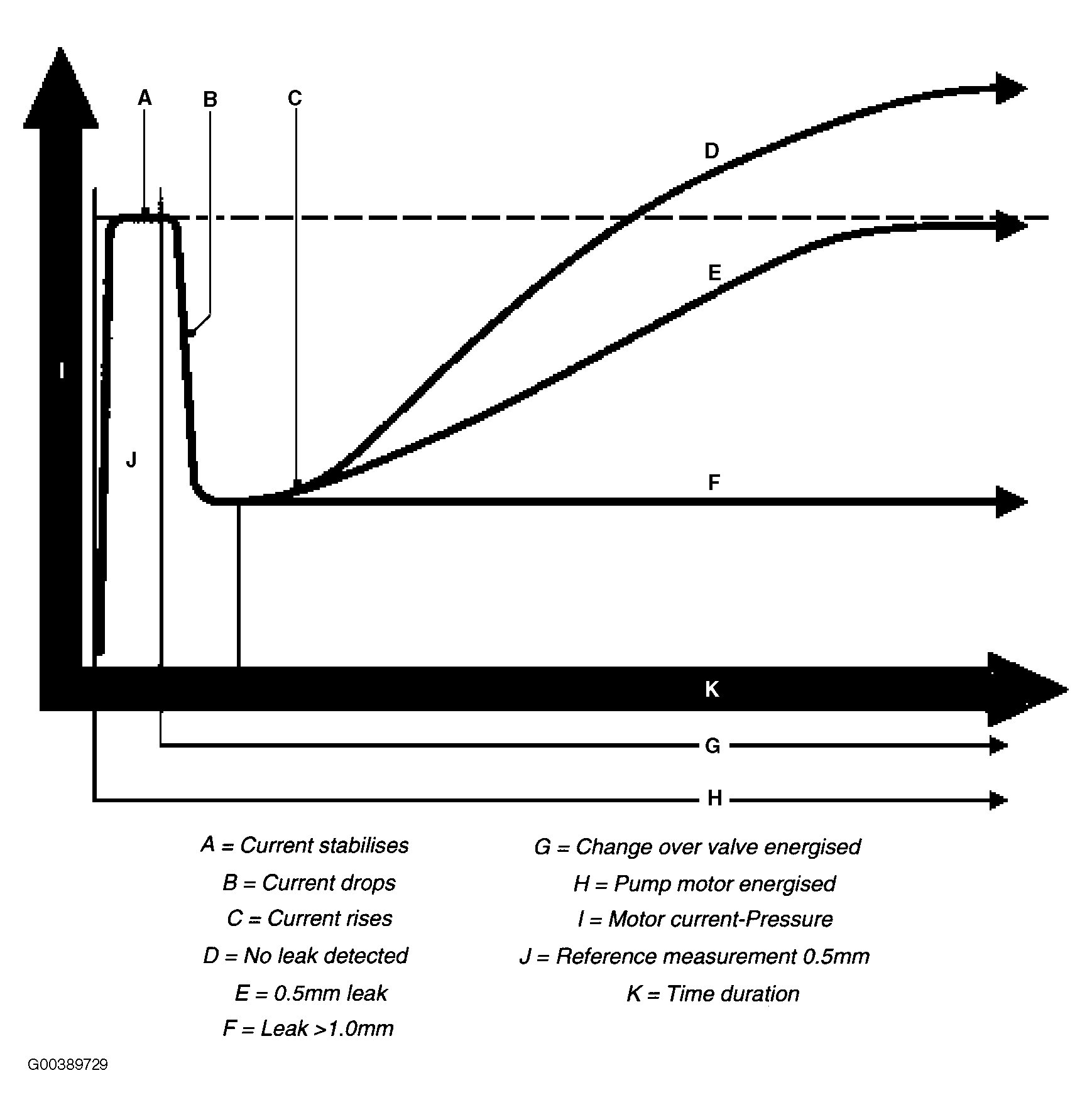 The time duration varies between 45-270 seconds depending on the resulting leak diagnosis test results (developed tank pressure "amperage" within a specific time period). However the chart above depicts the logic used to determine fuel system leaks. See Fig 1.