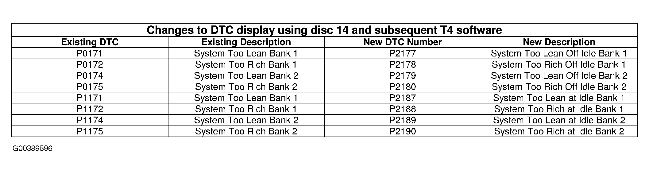 To provide compatibility with later 2005 model year DTCs, from disc 14 of the Range Rover TestBook/T4 diagnostic software, the DTCs in the following table will be displayed with new DTC numbers and descriptions. See Fig 1