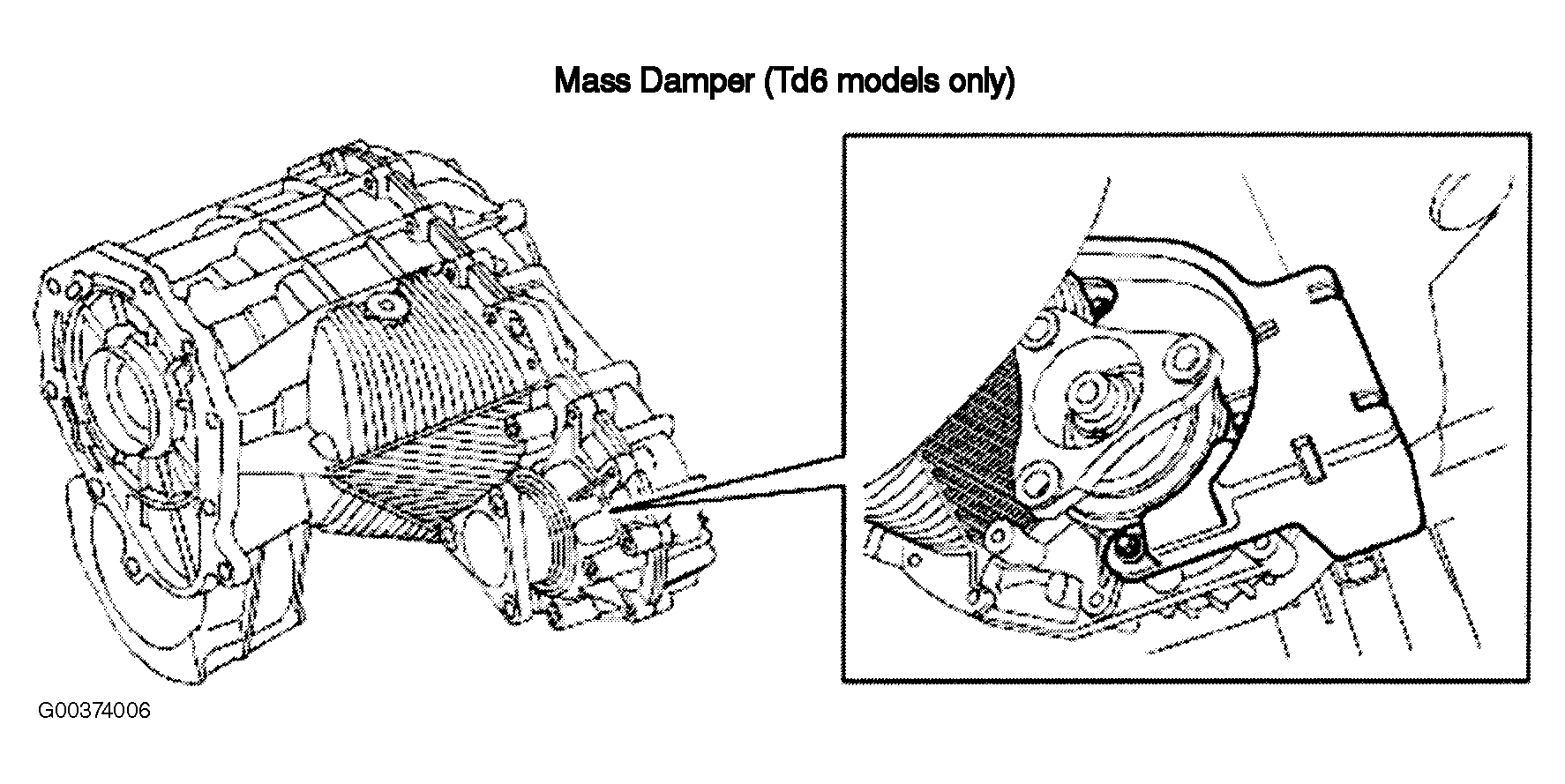 On Td6 engine models, a mass damper is fitted to the front casing assembly. The damper is located next to the front output flange and secured to the casing with bolts. See Fig 1. The damper absorbs vibration and resonance inherent with diesel engines, reducing passenger compartment noise and vibration.