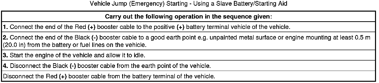 CAUTION: Ensure that the slave battery/starting aid are of 12 volt capacity and that all electrical loads on the disabled vehicle are switched OFF prior to connecting booster cables.
