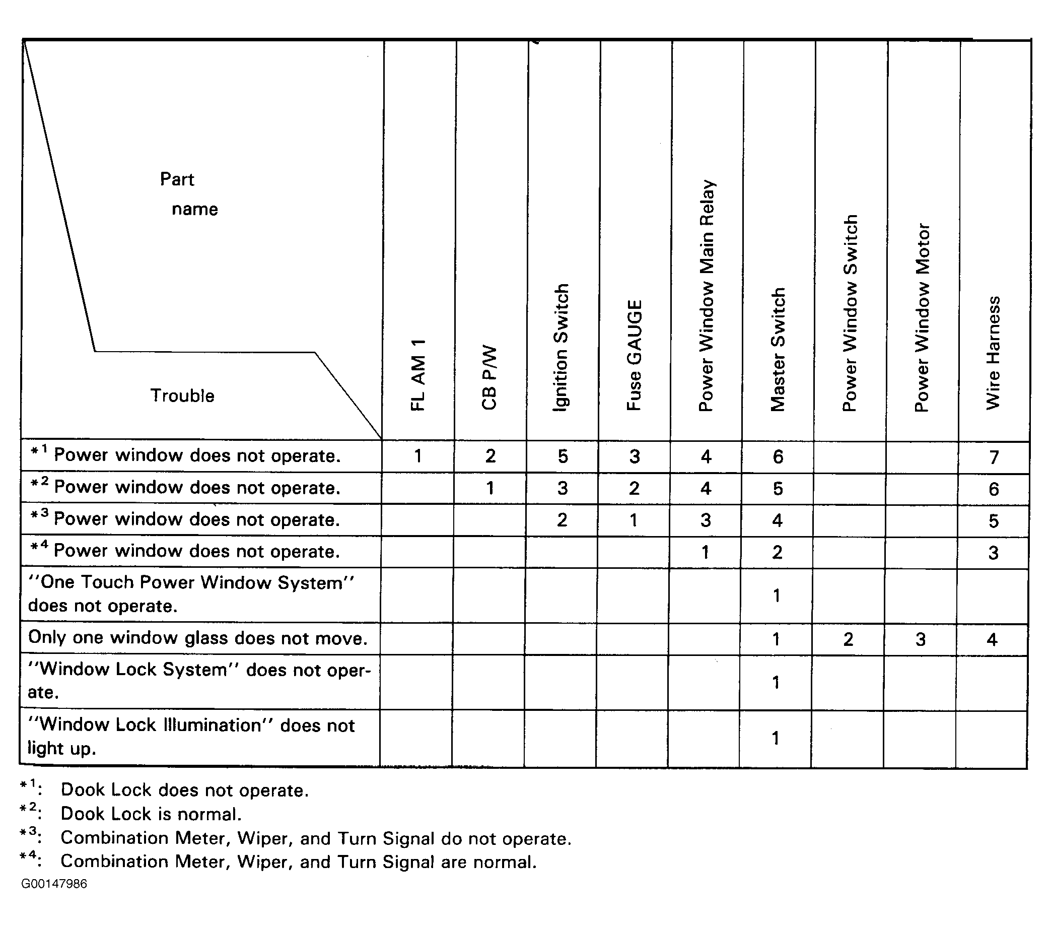 For help troubleshooting the power window system, see Fig 1.The numbers in the table indicate the order of priority of the causes of the fault in the system. Troubleshoot each part in the order shown.