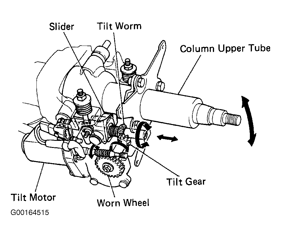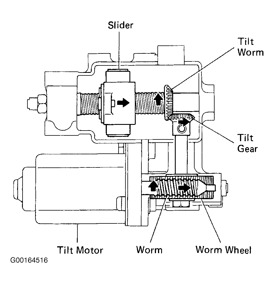 The control gear assembly consists of the worm wheel, tilt gear, tilt worm and slider, see Fig 2. Rotation of the tilt motor moves the slider towards the tilt worm. The column upper tube is integrated with the slider and is rotated up and down by movement of the slider. See Fig 3.