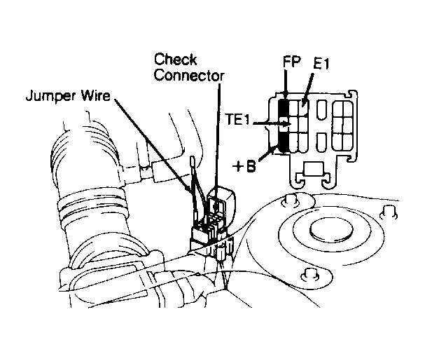 - Check fuel pressure. Ensure a sufficient amount of fuel is in fuel tank. Turn ignition off. Locate check connector. See Fig 1 or Fig 2. Using a jumper wire, connect check connector terminals +B and FP. See Fig 3. Turn ignition on.