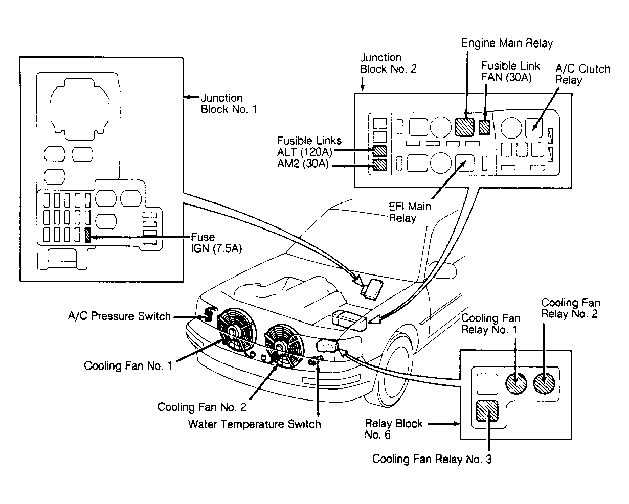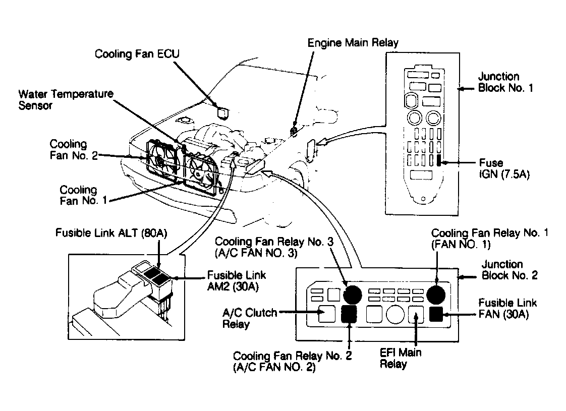 - Disconnect water temperature sensor/switch connector. See Fig 1 or Fig 2. With ignition on, cooling fans should operate. If cooling fans do not operate, check engine main relay and fuse. Check cooling fan motors. Also check cooling fan relays and water temperature sensor/switch. Check for damaged connectors or an open circuit between cooling fan relay and water temperature sensor/switch. If okay, go to step 3) for ES250 or step 4) for LS400.