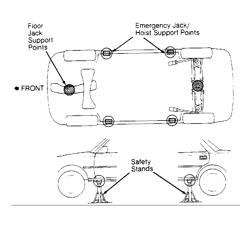 Place lift blocks on reinforced support points of side body panels (between front and rear wheels). See Figure or Fig 1.