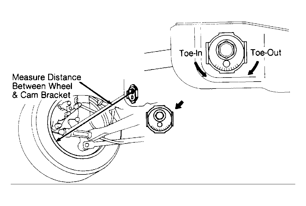 - Measure toe-in. See WHEEL ALIGNMENT SPECIFICATIONS . If necessary, adjust toe-in by turning adjustment cams. See Fig 1. Turning adjustment cam one graduation will change toe by about .06" (1.5 mm).