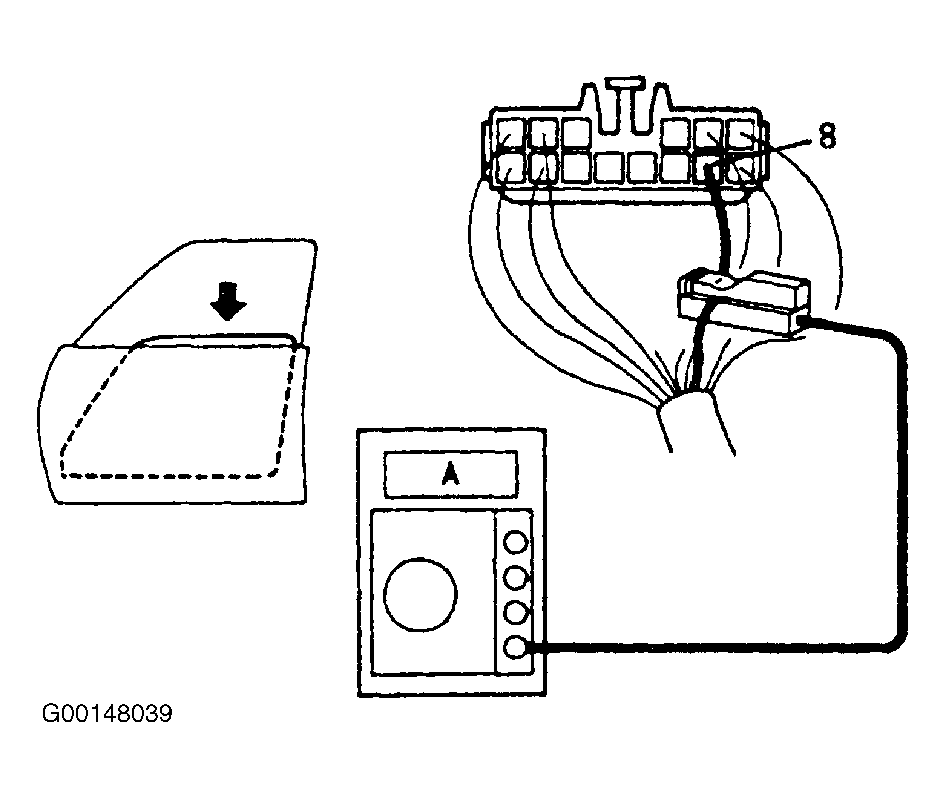 6. Check that the current increases up to approximately 14.5 A or more when the window stops going down. If operation is not as specified, replace the master switch