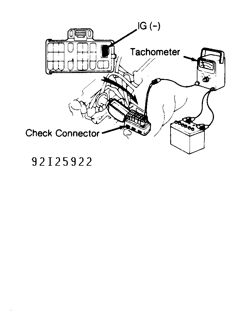 1. Ensure engine is at normal operating temperature. Connect timing light to engine. Connect tachometer to IG- terminal of engine check connector. See Fig 1.