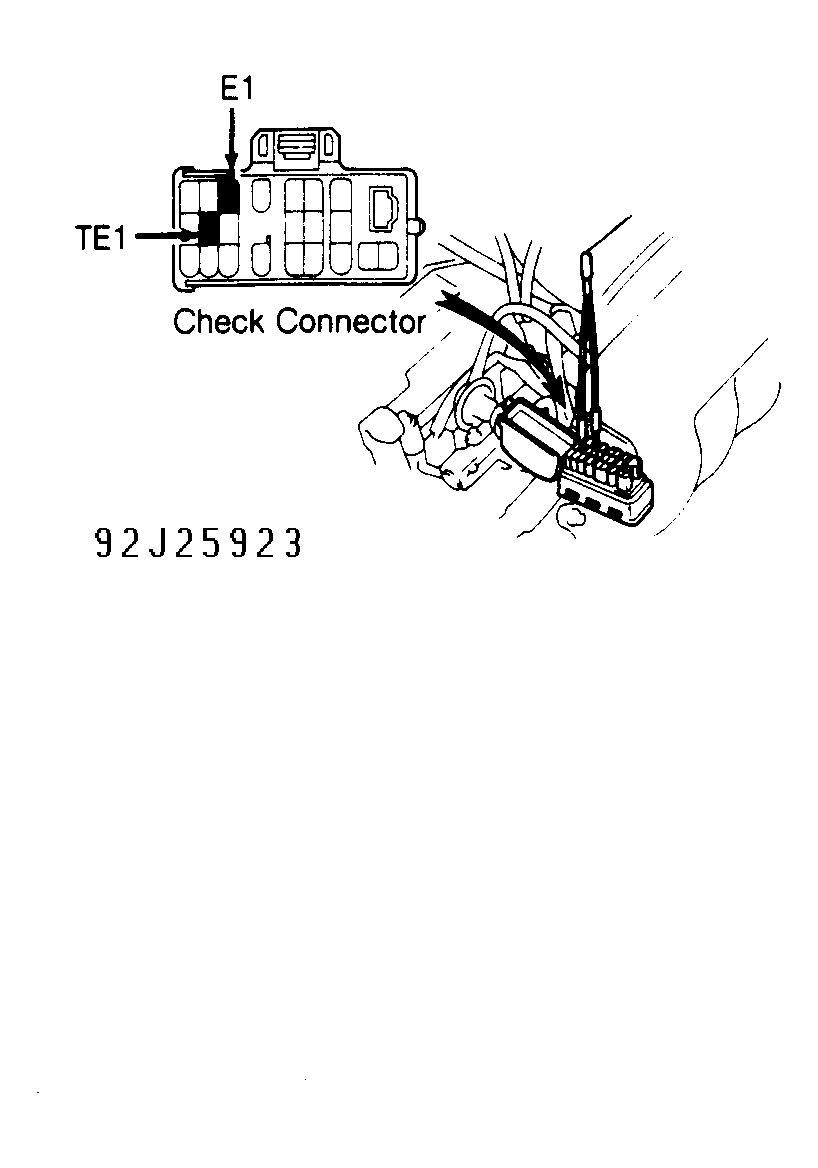 2. Install jumper wire between terminals TE1 and E1 of engine check connector. See Fig 2. Ensure idle speed is within specification. See IDLE SPEED SPECIFICATIONS  table under IDLE SPEED & MIXTURE. Ensure base timing is within specification. See IGNITION TIMING  table under ES300. Adjust timing by turning distributor.
