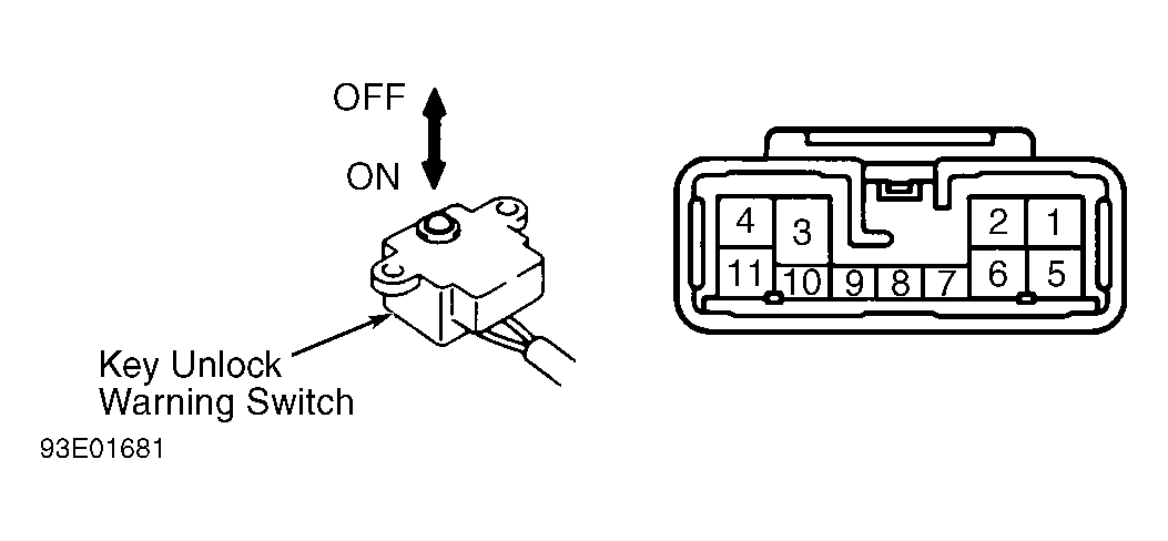 Remove key unlock warning switch. See KEY UNLOCK WARNING SWITCH under REMOVAL & INSTALLATION. Continuity should exist between connector terminals No. 9 and 10 only when ignition switch is in ON position. See Fig 1.