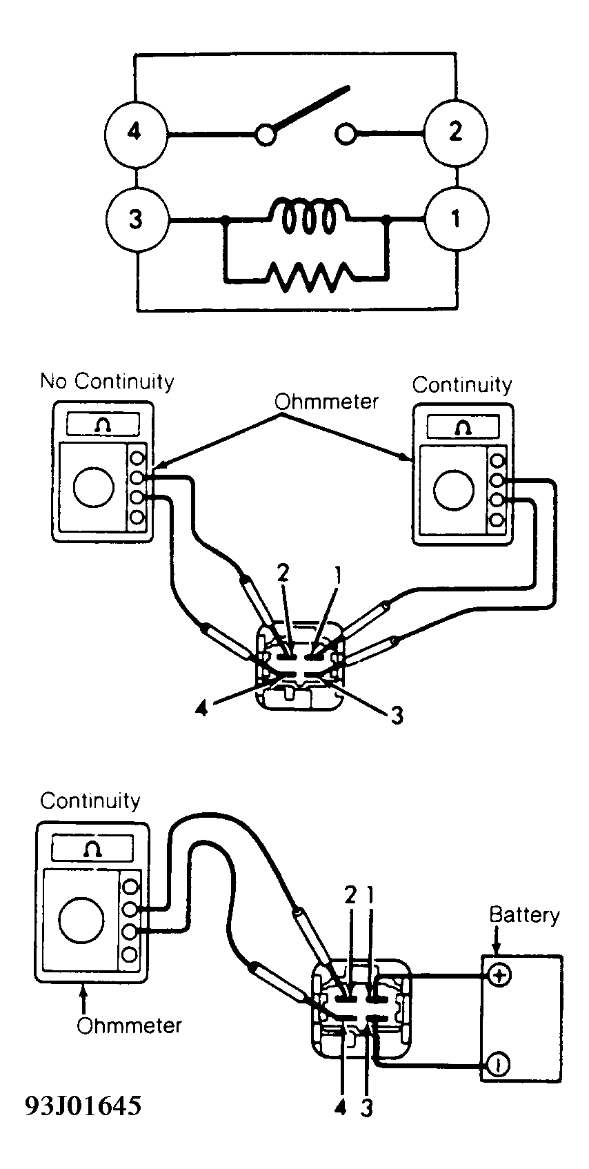 - Ensure continuity exists between terminals No. 1 and 3. See Fig 1. No continuity should exist between terminals No. 2 and 4. If continuity is not as specified, replace relay.