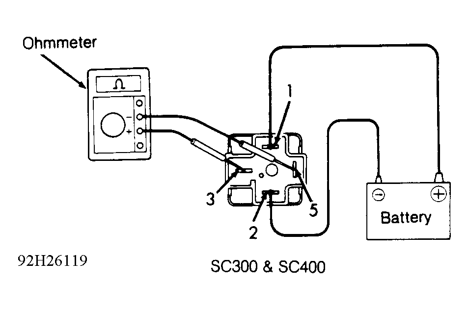 - On ES300, GS300, and LS400, apply battery voltage between relay terminals No. 1 and 3. Using an ohmmeter, check for continuity between relay terminals No. 2 and 4. On SC300 and SC400, apply battery voltage between terminals No. 1 and 2. Using an ohmmeter, check for continuity between relay terminals No. 3 and 5. If continuity is not present, replace relay.