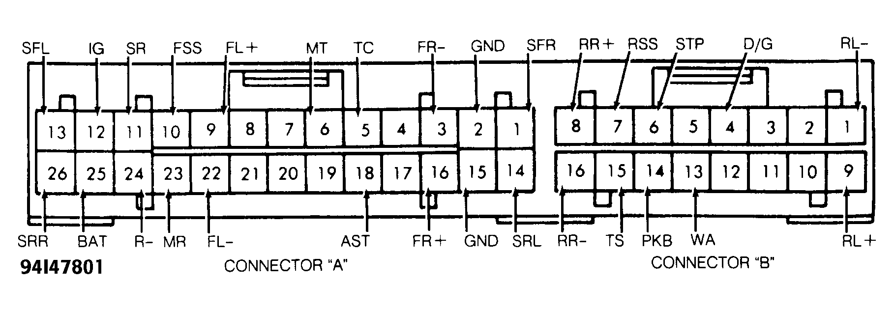 Ensure stoplights operate when brake pedal is pressed. Leave ABS ECU connectors attached. Measure voltage between chassis ground and terminal B6 of ABS ECU connector. See Figure. If battery voltage is present, stoplight switch circuit is okay. If battery voltage is not present, check circuit between stoplight switch and ABS ECU. If circuit is okay, replace ABS ECU.
