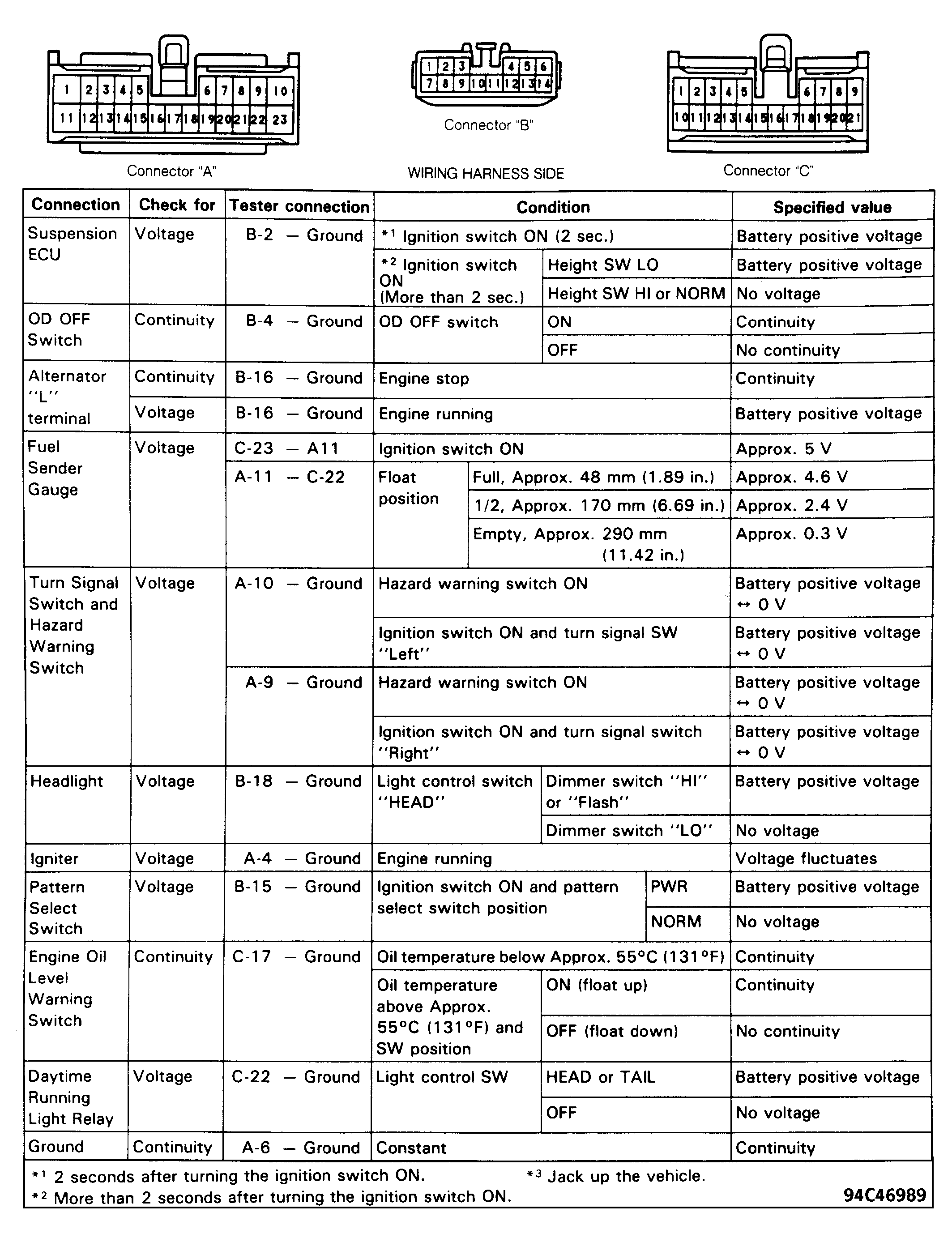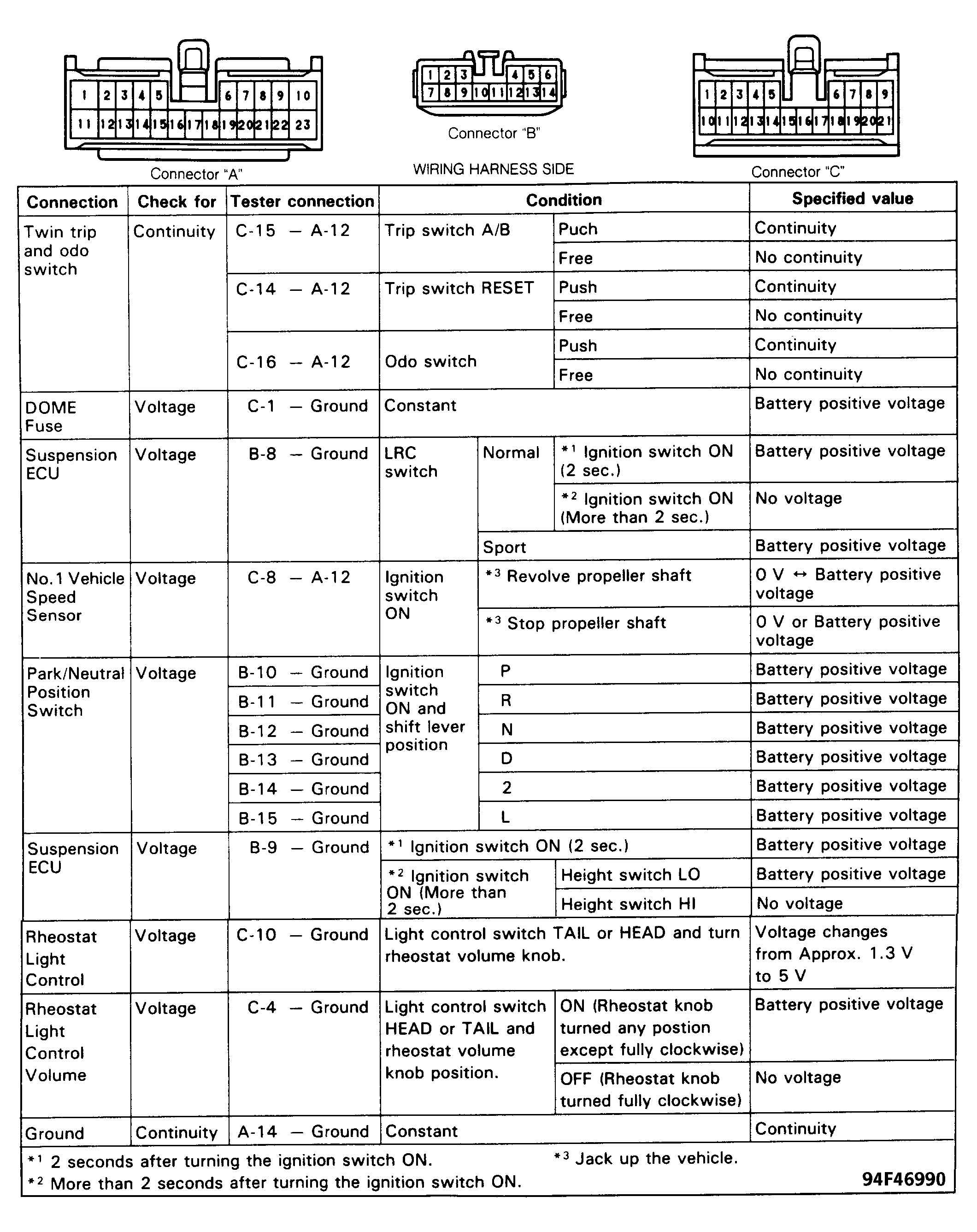- Disconnect instrument cluster connectors "A", "B" and "C". See Figure. Start engine. Check AC voltage at terminal No. 9 of connector "B" (harness side). See Figure or Figure