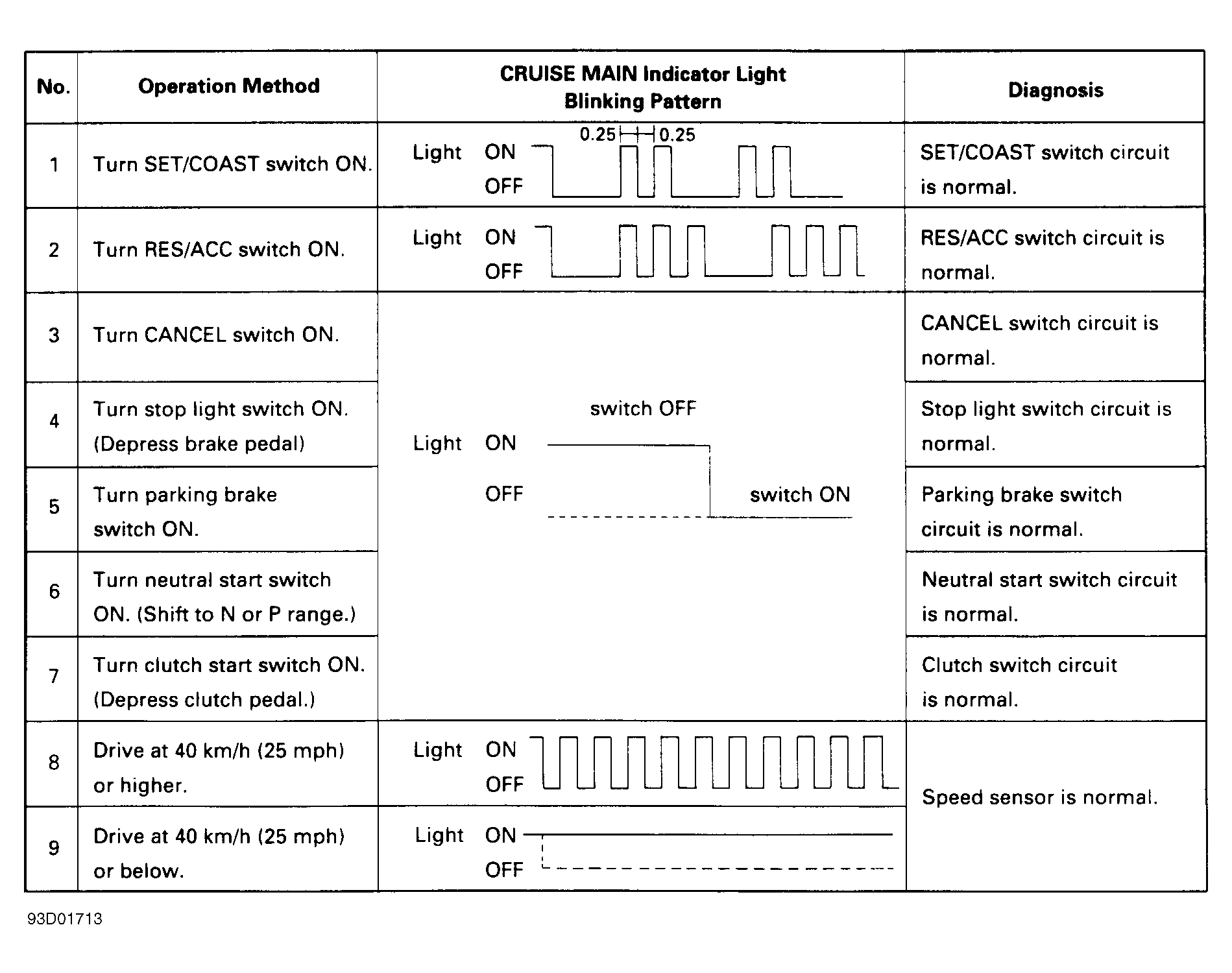 Operate appropriate switch (or simulate driving if checking speed sensor). See Figure. If cruise indicator light does not respond as specified, cruise control ECU is not receiving input signal due to a faulty circuit.