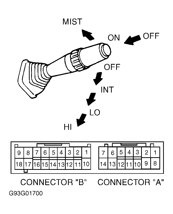 - Disconnect wiper/washer switch connectors. Move switch lever to INT position. Check resistance between the following terminals. See Figure.