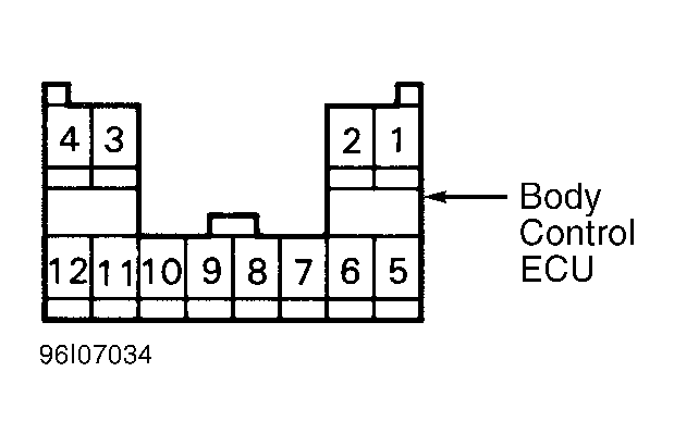 - Remove wiring harness clamp. Lower junction block. Disconnect 12-pin connector from body control ECU, located above junction block. Place shift lever in Neutral (or depress clutch pedal). While holding ignition switch in START position, measure voltage between body ground and terminal No. 2 of body control ECU. See Fig 1.