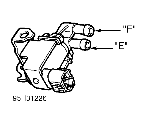 4. Using jumper wires, apply battery voltage to VSV terminals. Air from pipe "E" should exhaust out pipe "F". See Fig 1. Disconnect jumper wires. Air should not exhaust out pipe "F". If VSV does not operate as specified, replace VSV. If VSV operates as specified, check for open or short circuit in wiring harness between EFI main relay and ECM. See appropriate wiring diagram in appropriate WIRING DIAGRAMS article. Repair as necessary. If wiring is okay, replace ECM and retest.