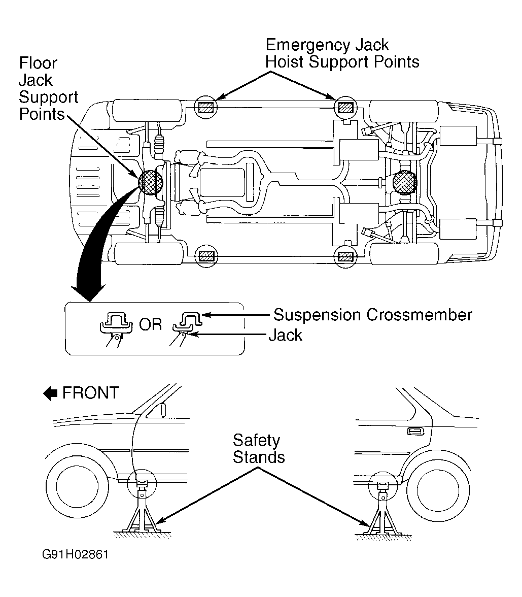 Place manufacturer-supplied jack under reinforced support points of sill between front and rear wheels. Safety stands may also be placed at these points. See Figure.